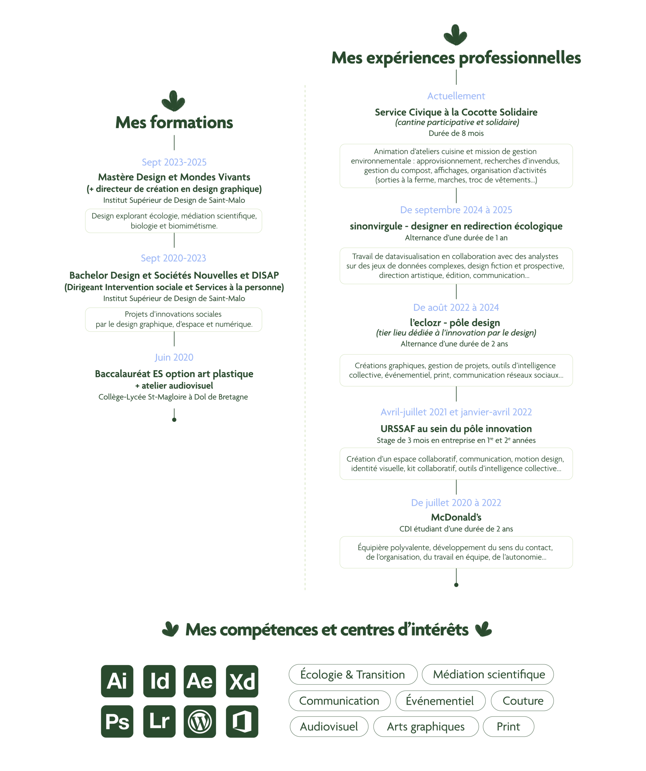 Nouvellement diplômée du Master Design & Mondes Vivants, je me lance en freelance avec une double expertise : médiation scientifique et direction artistique. Mes projets explorent les liens entre le vivant, la transition écologique et les territoires. N’hésitez pas à venir discuter de vos projets !