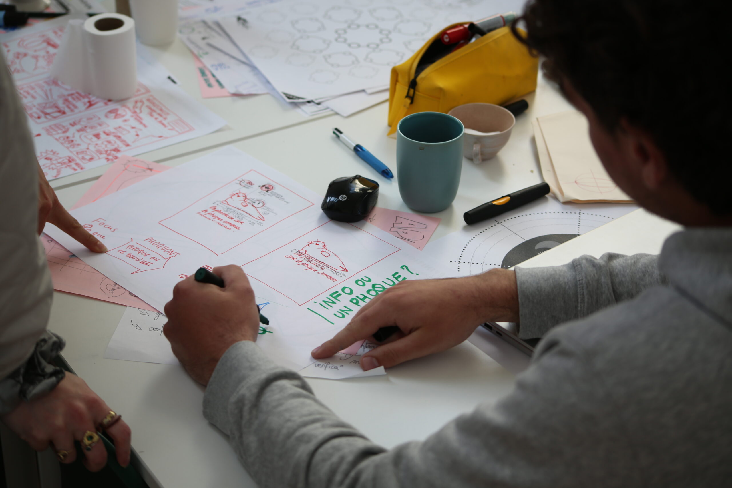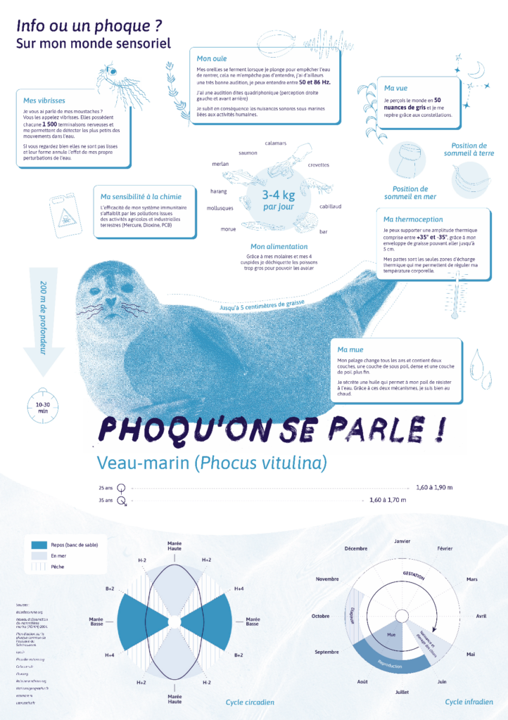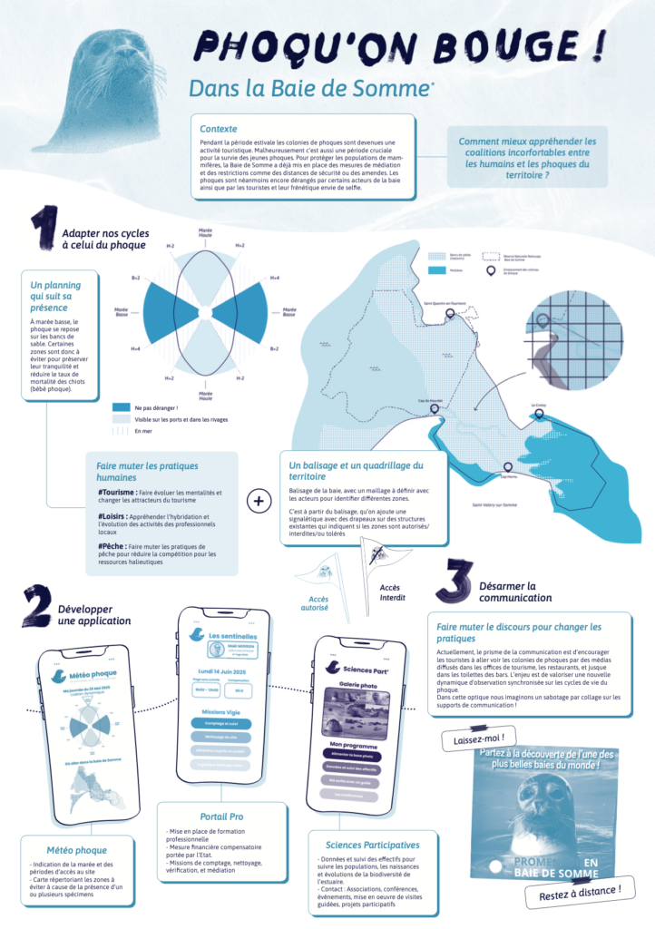 Ce workshop a été réalisé en collaboration avec le collectif Zoepolis et animé par Nicolas Roesh. Nous avons produit des affiches pédagogique pour repenser les mondes humains à partir des mondes non-humains. Grâce à la méthode MUCE (Méthode Umwelt, Cycles, Ethos), nous questionnons la manière humaine d’habiter le territoire en relation avec d’autres espèces. Dans le cas du phoque dans la Baie de Somme, l’objectif était d’éloigner les touristes en mettant en place des règles basé sur le cycles infradiens et circadiens du phoque. Mais aussi de transformer le tourisme autour du phoque par de nouvelles façon de l’observer.